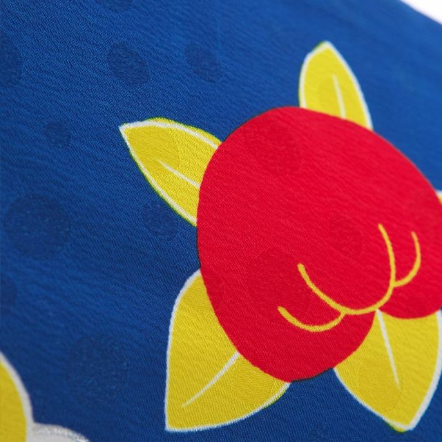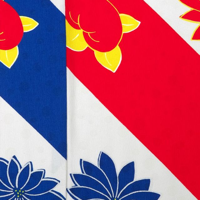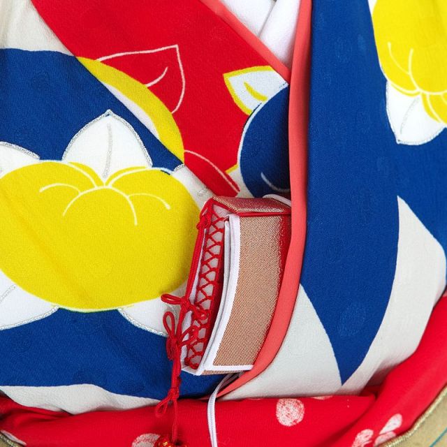 水玉の地模様があしらわれた青、白、赤をななめに配色した“しま模様”がぱっと目を引く、おしゃれな一着です。明るく爽やかな青と白に、赤色のアクセントが、モダンでレトロな可愛らしさを演出してくれます。青や赤で大きく描かれている“菊”は、美しく香しい花です。花柄文様の中では品の高い花として古くから好まれてきました。「長寿」や「邪気払い」の意味を持ちます。黄や赤で描かれているのは“桃の実”。桃の木は古くから、魔よけのシンボルとされ“邪気払い”の力を持つとされてきました。また、有名な「桃太郎」のお話からもイメージできるように「幸運」「勝利」など力強いイメージを持ちます。元気で活発なお子様の健やかな成長を願う絵柄です。光沢感のある“帯”と“帯揚げ”が、着物の明るい色に大人っぽさをプラス。“帯締め”の黄色も菊や桃の色と統一感がされ、とてもおしゃれです。とびきり可愛らしく、でも少しおしゃれな雰囲気も楽しめます。ご家族にとって大切な晴れの日を、笑顔いっぱいにしてくれる一着です。