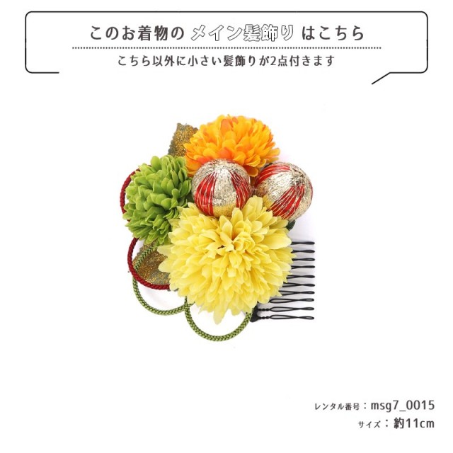 | 付属品 | 女の子七五三(7歳女の子用)に含まれる物:着物、長襦袢(カット袖)、作り帯、草履、バッグ、帯揚げ、箱迫、帯〆、しごき、末広(扇子)、足袋、腰紐(3本)、コーリンベルト、伊達締め、髪飾り |