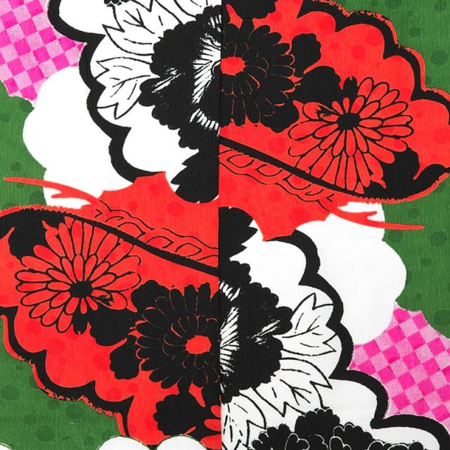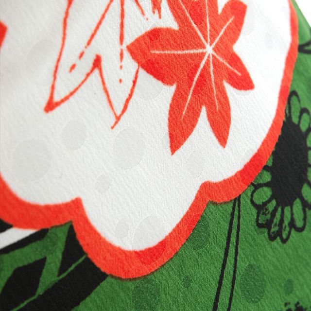 深緑、朱、白がそれぞれを引き立たせ、個性的でおしゃれな色の組み合わせです。地色にはさりげなく水玉の地模様がほどこされ、可愛さも演出しています。それぞれのお色が雲取りで染め分けられています。“雲”は古くから神や龍が存在すると言われ、不思議な力を持つものとされてきました。良い事の前兆を意味し、おめでたい文様として描かれます。ところどころにあるピンクの“市松模様”が可愛らしさをアピール。深い色合いの中で明るいピンクが程よいアクセントになっています。柄が無限に広がっていく市松模様は、「子孫繁栄」や「事業拡大」の意味を持ち、縁起のよい模様として好まれています。モノトーンでクールに描かれているのは“菊”と“向日葵”の花。菊は「長寿」や「厄払い」、向日葵は「情熱」の意味を持ちます。朱色で描かれている“紅葉”は「長寿」の象徴とされています。また季節によってその色を変え、人を喜ばせることから「世渡り上手な幸せ者」と言う意味があります。アンティークな雰囲気ただようおしゃれな一着。晴れの日のお子様の魅力を引き立て、ご家族を笑顔にしてくれることでしょう。