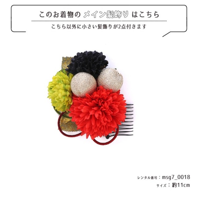 | 付属品 | 女の子七五三(7歳女の子用)に含まれる物:着物、長襦袢(カット袖)、作り帯、草履、バッグ、帯揚げ、箱迫、帯〆、しごき、末広(扇子)、足袋、腰紐(3本)、コーリンベルト、伊達締め、髪飾り |