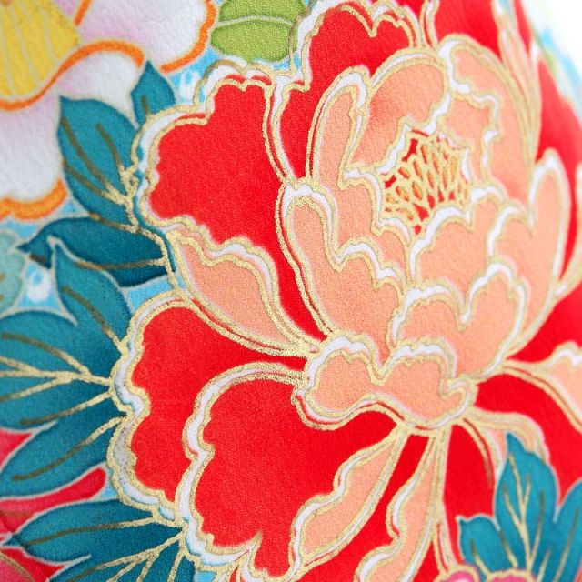 水色、黄緑糸、ピンクの鹿の子斑(まだら)の地模様がとても可愛らしく、全体的にグラデーションがかかった色使いが優しくも鮮やかです。そこへ大小さまざまのお花が艶やかに、惜しみなく色彩豊かに描かれています。まるで華やかなお花の優しさに包まれるように、お着物が女の子の可愛らしさやあどけなさを引き立ててくれることでしょう。一番大きく、中央に描かれているのは“牡丹の花”です。花言葉は「高貴」、「壮麗」、「誠実」。「百花の王」と呼ばれるほどに美しく風格のある花です。絹のように美しい花びらが幾重にも重なり、ふくよかに、そして優雅に着物を彩っています。また牡丹の他にも“菊”、“桜”、“梅”、“藤の花”などが、それぞれお子様の幸せな未来を願う意味をこめて描かれ、お子様を優しく見守ります。華やかなお着物が女の子の幸せ願う晴れの日にふさわしく、ご家族の幸せな思い出を彩ってくれるでしょう。