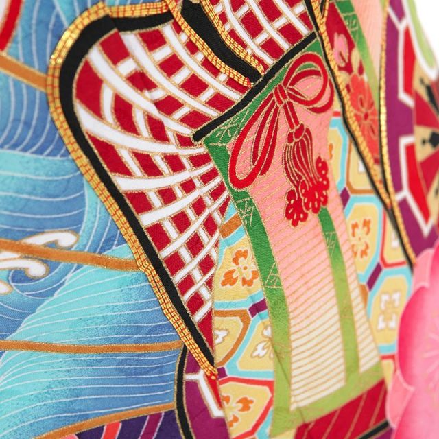 パッと見たとき、珍しいお色だな、と思いました。和色辞典と照らし合わせて、ここでは「青紫」と表現します。文字の通り、青と紫の中間のような、とっても大人っぽいお色です。寒色系のベースカラーですが、その分、柄の赤・ピンクがとてもよく映える、華やかな一着です。メインの柄も、大胆に描かれています。背景にあるのは、「檜扇(ひおうぎ)」です。平安時代の宮中で用いられていた木製の扇で、実用的なものというよりは、儀礼用に使われていたものでした。十二単姿のお姫様が身につけていたイメージが強く、実はお雛様も持っているので、もしかしたらご覧になったことがある方もいらっしゃるかも。その檜扇に挟まれているのは「御所車(ごしょぐるま)」。その昔、平安貴族が移動に使っていた乗り物です。お袖には、「鼓(つづみ)」も描かれています。貴族への憧れがたっぷりと詰まった晴れ着になりました。間を埋めるように咲く梅の花からは、今にもふくよかな香りが漂ってきそう。帯揚げと・志古貴(しごき)で、現代らしい蛍光色を加えました。小物でオリジナリティも表現できます。こだわりの一着、お友達とはちょっと違う七五三にしたい、そんなお嬢様におすすめです。