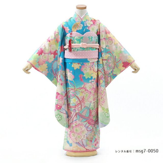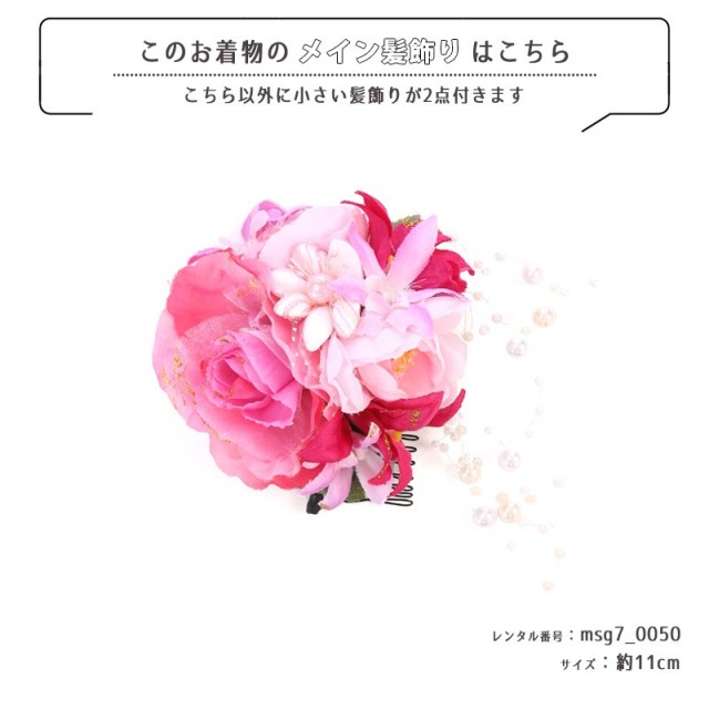 | コーディネート | 女の子七五三(7歳女の子用)に含まれる物:着物、長襦袢(カット袖)、作り帯、草履、バッグ、帯揚げ、箱迫、帯〆、しごき、末広(扇子)、足袋、腰紐(3本)、コーリンベルト、伊達締め、髪飾り |