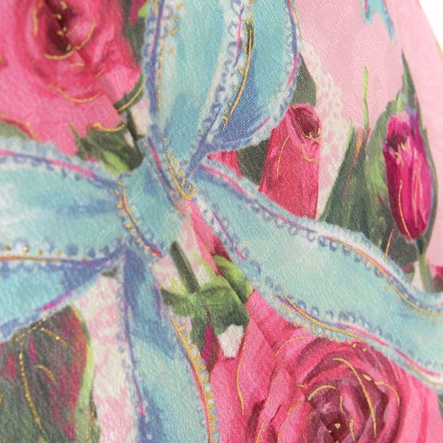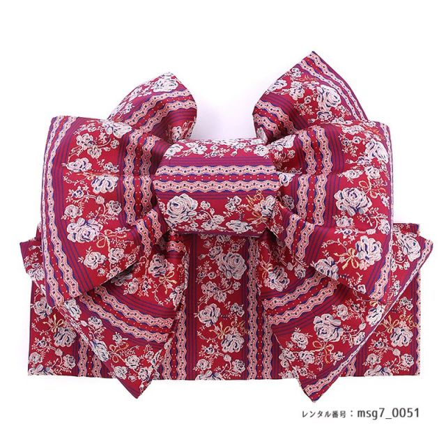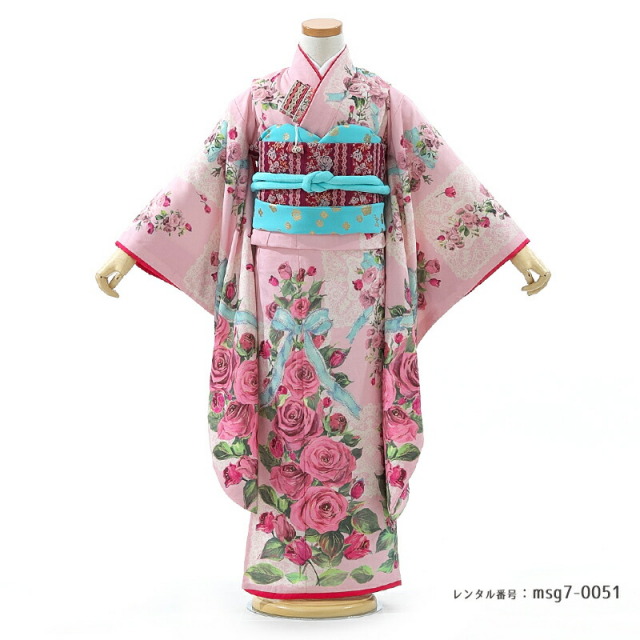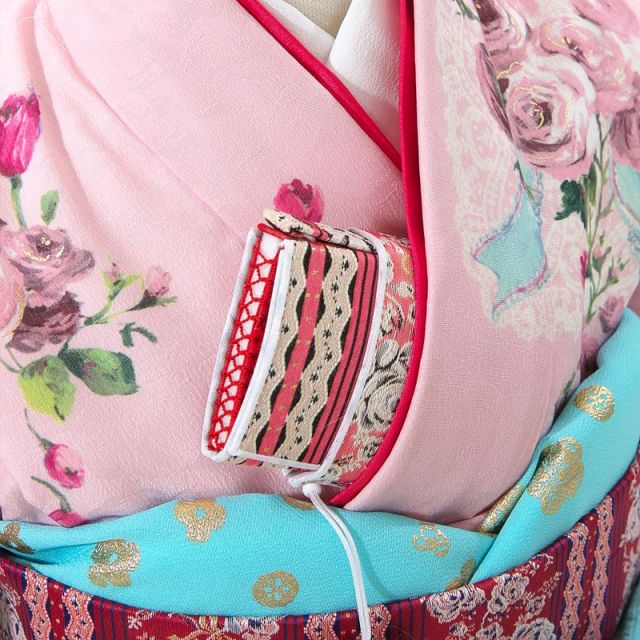 「ロマンティック&スウィートなテイスト」を掲げる子供服ブランドのメゾピアノがその世界観を存分に表現したモダン柄の着物です。ピンクの地色の着物には写実的な薔薇が咲き誇っています。バラは古典的な着物の柄ではありませんが、現代では薔薇の花言葉が「愛情」、特にピンクのバラは「上品」の意味も持つことから女の子の象徴として着物にも多く使われています。薔薇にあしらわれたスカイブルーのリボンがアクセントとなり、ピンクの可愛らしい世界に爽やかな風を吹かせています。写実的な薔薇やリボンに描かれる金のラインはお祝い事で使われる色で、女の子の成長を喜ぶお祝いの気持ちが込められています。ピンクの地色に乗せた白いレースのような柄が日本の昔ながらの文様である市松模様のように配置され、モダンな中に日本の伝統文様の要素も取り入れています。帯には大人っぽいワインレッド、帯揚げ・帯締め・しごきにはビビットなブルーを使うことで、着物のスウィートさにアクセントを加え、コーディネート全体で可愛らしさと大人の女性への成長を願う気持ちを表しています。