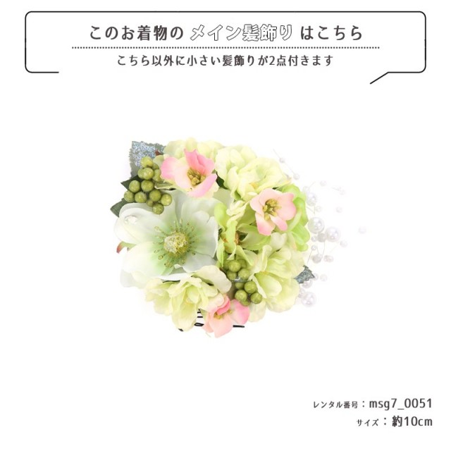 | コーディネート | 女の子七五三(7歳女の子用)に含まれる物:着物、長襦袢(カット袖)、作り帯、草履、バッグ、帯揚げ、箱迫、帯〆、しごき、末広(扇子)、足袋、腰紐(3本)、コーリンベルト、伊達締め、髪飾り |