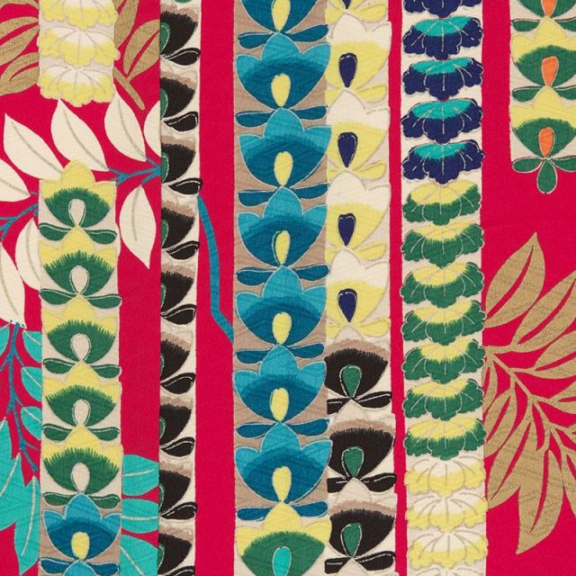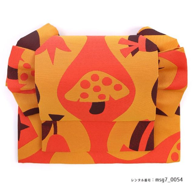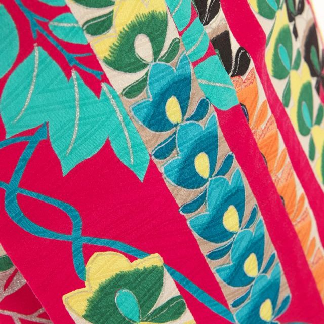 「未来と過去をつなぐ」をコンセプトにモダンさとレトロさを兼ね備えた着物を製作するモダンアンテナ。古布のデザインを復刻し、現代に蘇らせたレトロモダンを象徴するアンティーク風の藤柄の着物です。その大胆に縦に伸びる藤が幾何学模様のように着物全体に配置され、大正・昭和レトロの雰囲気全開に仕上がっています。藤はつるを巻きつけどんどん伸び、花をたくさん付けることから、日本では古来より「子孫繁栄」の象徴として親しまれてきました。元気な子に育って欲しいという両親の思いを感じられる1着です。着物の柄にはお祝い事で多用される金と銀が効果的に使われており、派手でモダンな柄の中にお祝いの気持ちをしっかりと表現しています。帯は落ち着いたオレンジ色に大きな幾何学模様が茶色と赤であしらわれ、帯揚げと帯締めにはあえて黒を用いることにより、着物の柄を引き立たせています。着物の大胆な柄と色使いを最大限に引き出したレトロモダンなコーディネートです。