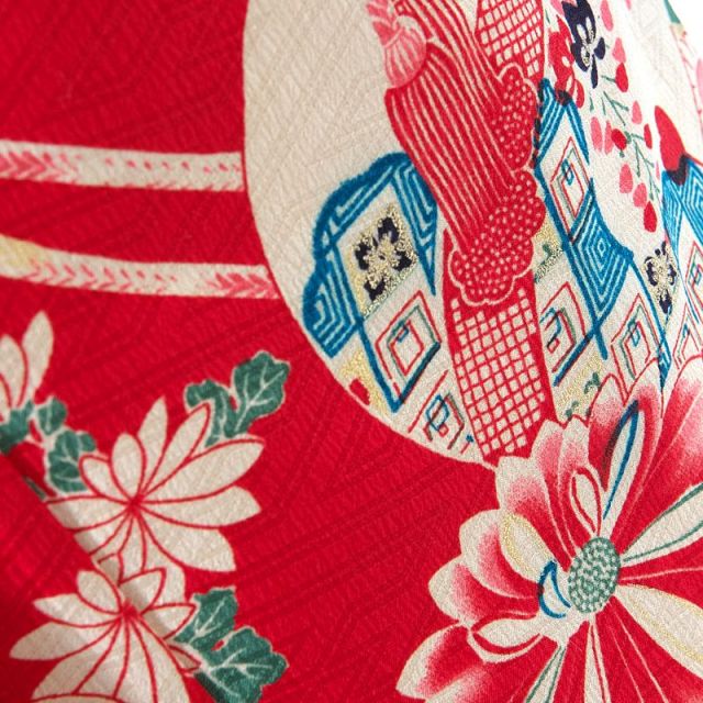 「未来と過去をつなぐ」をコンセプトに女の子を魅了するレトロ可愛い着物を世に送り出しているモダンアンテナ。レトロ好きにはたまらない女の子らしさの象徴である手毬(てまり)が着物全体に配置され、女の子の成長を祝う両親の気持ちを全体で感じられる1着。手毬は女の子の遊び道具であった事から、古くから女の子・女性の象徴として大切にされ、子供や女性の着物の柄として愛されてきました。「手毬のように丸々と健康に育ちますように」「生涯において物事が丸く収まり幸せな人生を歩みますように」という願いが込められており、魔除けの意味も持っているため、お守りとして嫁入り道具に手毬を持たせる地域もあったそうです。手毬とともに着物全体に咲き誇る花や植物は伝統的な着物の柄に用いられる縁起の良いものばかり。「梅」「菊」「竹」「橘」などどれも美しさや長寿などの象徴として親しまれ、大切にされてきた柄です。帯や帯揚げ・帯締めにはあえて落ち着いた色味を取り入れる事で、着物の美しさを引き立て、愛情いっぱいに育つ女の子の可愛らしさを全面に出したコーディネートです。