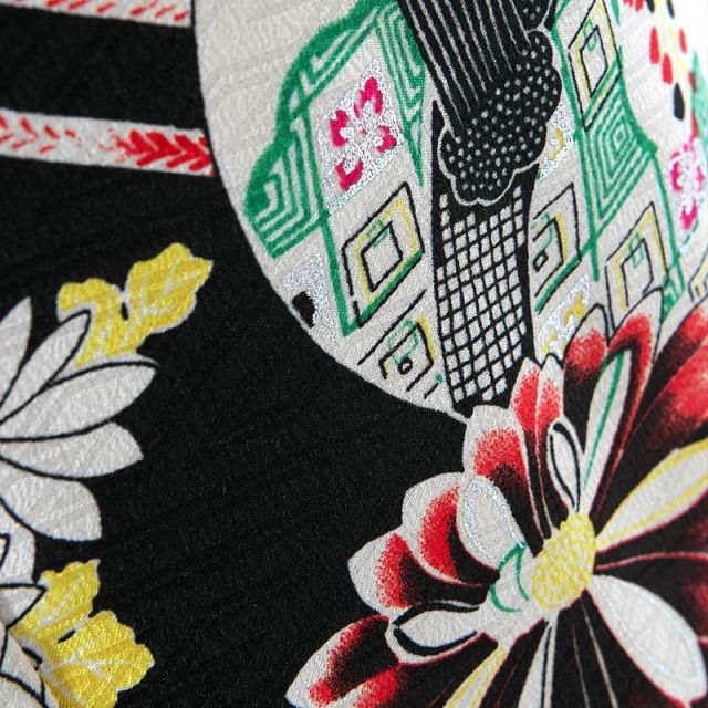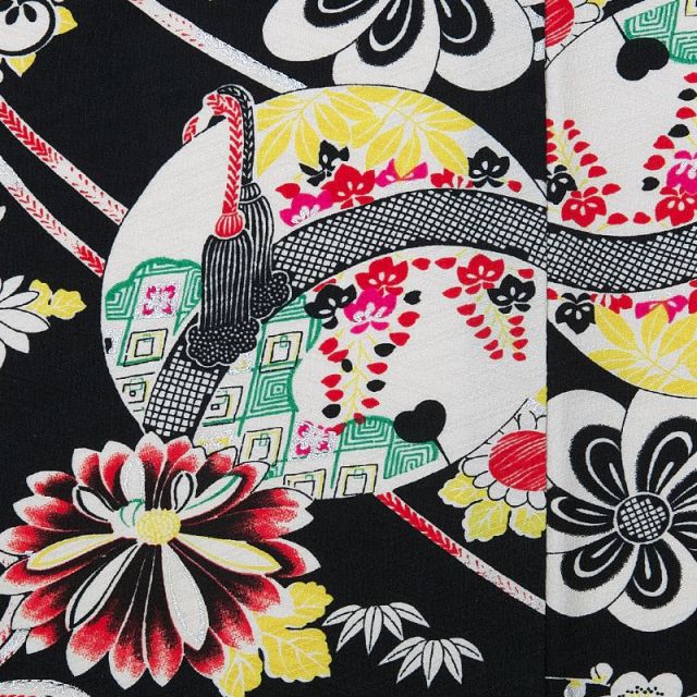 「未来と過去をつなぐ」をコンセプトに女の子を魅了するレトロ可愛い着物を世に送り出しているモダンアンテナ。女の子らしさの象徴である手毬(てまり)を着物全体に配置し、大正ロマンを感じさせるレトロ可愛い配色が心をくすぐる1着です。昭和初期には花嫁衣装として黒地の振袖を着ることが一般的で、振袖の柄には幸せを象徴する柄として手毬が描かれることも多くありました。手毬は女の子の遊び道具であった事から、古くから女の子・女性の幸せの象徴として大切にされ、子供や女性の着物の柄として愛されてきました。「手毬のように丸々と健康に育ちますように」「生涯において物事が丸く収まり幸せな人生を歩みますように」という願いが込められており、娘を思う両親の気持ちを表す大切なお守りのような存在です。手毬とともに着物全体に咲き誇る花や植物は伝統的な着物の柄に用いられる縁起の良いものばかり。「梅」「菊」「竹」「橘」などどれも美しさや長寿などの象徴として親しまれ、大切にされてきた柄です。帯の柄には青を取り入れ、しごきには紅白の市松模様を取り入れることにより、レトロな手毬の柄が引き立つおしゃれなコーディネートです。