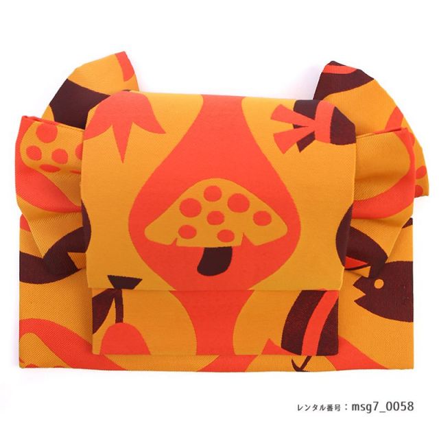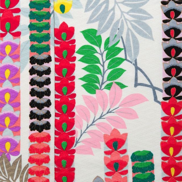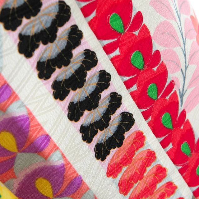 「未来と過去をつなぐ」をコンセプトにモダンさとレトロさを兼ね備えた着物を製作するモダンアンテナ。古布のデザインを復刻し、現代に蘇らせたレトロモダンを象徴する爽やかなアンティーク風の藤柄の着物です。その大胆に縦に伸びる藤を幾何学模様のように着物全体に配置し、たくさんの色をあしらって華やかなレトロワールド全開。白い地色が様々な色で描かれた藤の柄を引き立てます。藤はつるを巻きつけどんどん伸び、花をたくさん付けることから、日本では古来より「子孫繁栄」の象徴として親しまれてきました。また「藤」は「不死」とも聞こえることから、不老不死の意味合いも持ち、縁起のよい花としても大切にされています。着物の柄にはお祝い事で多用される金と銀が効果的に使われており、派手でモダンな柄というだけでなく、お祝いの意味もしっかりと込められています。帯は落ち着いたオレンジ色に大きな幾何学模様が茶色と赤であしらわれ、帯揚げと帯締めには着物の地色に近い白を使うことで、一体感を感じさせます。着物の大胆な柄と色使いを最大限に引き出したレトロモダンなコーディネートです。