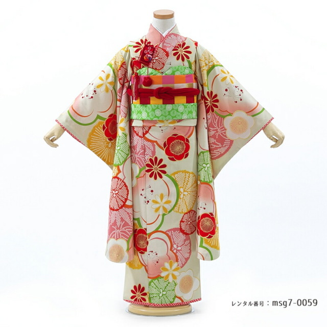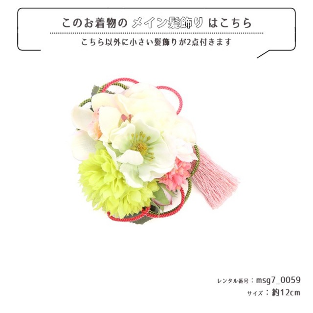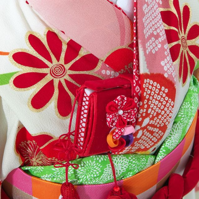 | コーディネート | 女の子七五三(7歳女の子用)に含まれる物:着物、長襦袢(カット袖)、作り帯、草履、バッグ、帯揚げ、箱迫、帯〆、しごき、末広(扇子)、足袋、腰紐(3本)、コーリンベルト、伊達締め、髪飾り |