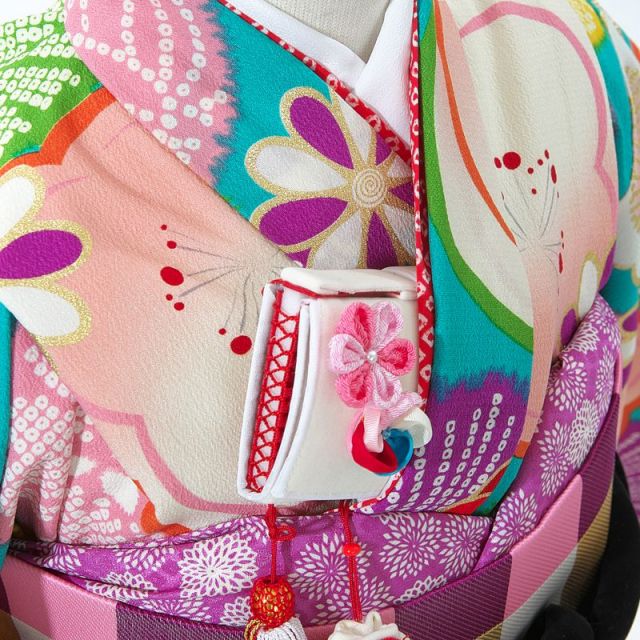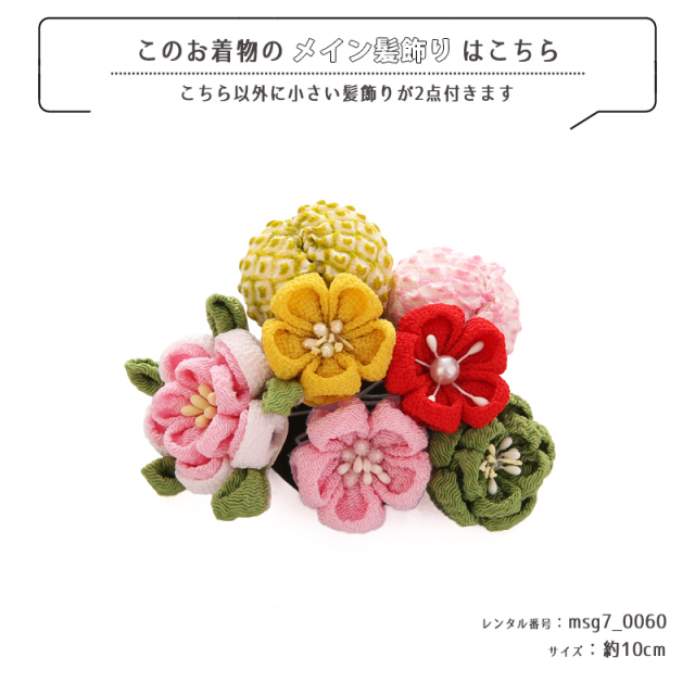 | コーディネート | 女の子七五三(7歳女の子用)に含まれる物:着物、長襦袢(カット袖)、作り帯、草履、バッグ、帯揚げ、箱迫、帯〆、しごき、末広(扇子)、足袋、腰紐(3本)、コーリンベルト、伊達締め、髪飾り |