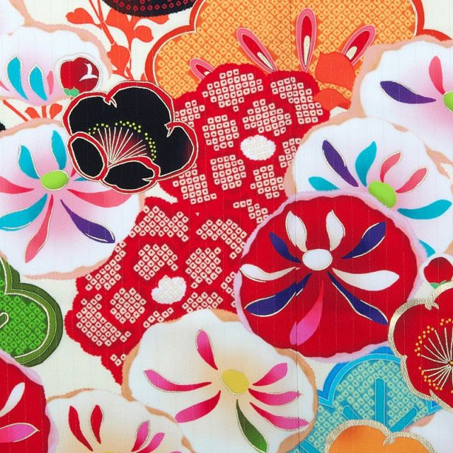 こってりとしたデザインが可愛い大正ロマン風のお着物です。はっきりとした主張の強い色合いは、元気いっぱいのお嬢様に負けない個性で可愛いですね。このお着物のようにハツラツとして笑顔がはじけるお嬢様に是非お召しになっていただきたい一式です。こってりとしてロマンチックなこのお着物は子どもらしいビビットな色使いながら、伝統にのっとった正統派の晴れ着でもあるんですよ。七五三のお祝い着を飾る文様として人気の、梅、松、牡丹、鹿の子などの王道の吉祥文様をきちんと描いています。例えば、「松」は寒い冬の時期にも青々とした葉を付けていることから「長寿」、「牡丹」は小さなつぼみから大輪の花が開くことから「大成」といったおめでたい意味があります。ただ個性的で派手なだけではなく、伝統にそくした礼装なのです。カラフルで個性的なこのお着物が、上品な雰囲気も持っているのには色使いに秘密があります。平安時代に貴族が愛用した「韓紅(からくれない)」と呼ばれる気品のある濃い紅赤色や深みのある黒をさし色にすることで、ぐっと引き締まり、華やかながら上品な印象を与えています。個性的なおしゃれを楽しみたいお嬢様のハレの日にぴったりのお着物です。