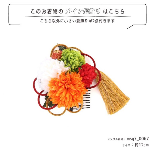 | コーディネート | 女の子七五三(7歳女の子用)に含まれる物:着物、長襦袢(カット袖)、作り帯、草履、バッグ、帯揚げ、箱迫、帯〆、しごき、末広(扇子)、足袋、腰紐(3本)、コーリンベルト、伊達締め、髪飾り |