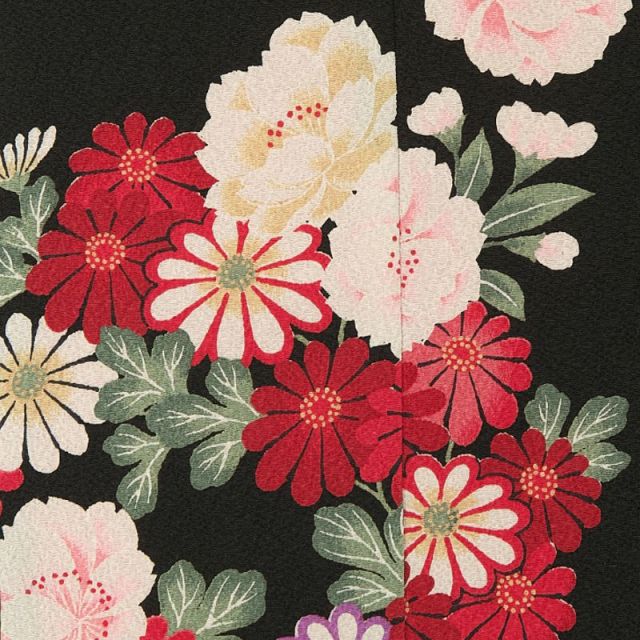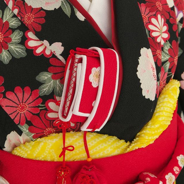 赤と黒と薄ピンクのコントラストが可愛い乙女チックなお着物です。乙女の可愛らしさと気品のある女性らしさが両立するこの晴れ着は、お嬢様の健やかな成長を願うお祝いの席にぴったりですね。黒は地味?いいえそんなことはありません。実は黒って最も格式の高い色なんですよ。男性の正装であるモーニングや既婚女性の第一礼装である黒留袖はみんな黒を主体としています。黒をメインカラーにすることで、昭和時代に花嫁衣装として人気の高かった「黒引き留袖」のような高級感を持たせています。晴れ着にふさわしく、「長寿」を意味する菊や、「豊かさ」を意味する桜の吉祥文様を描いています。帯揚げとしごきに使われているビビットな黄色は、黄蘗(きはだ)と呼ばれる奈良時代から使われている伝統色です。本質的にはとても伝統的なデザインのお着物ですが、乙女チックな甘さがあるので現代のセンスから見ても可愛らしさ満点ですね。目を引く大胆な色使いなので写真映えも抜群ですよ。七五三のお着物に格式の高さを求めるご家庭でも十分にご満足いただける一式です。