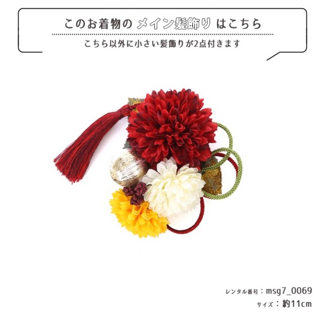 | コーディネート | 女の子七五三(7歳女の子用)に含まれる物:着物、長襦袢(カット袖)、作り帯、草履、バッグ、帯揚げ、箱迫、帯〆、しごき、末広(扇子)、足袋、腰紐(3本)、コーリンベルト、伊達締め、髪飾り |