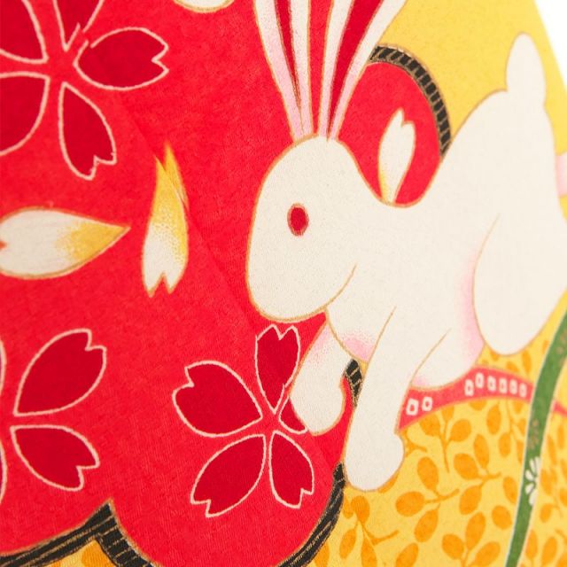 やわらかなクリーム色がベースのお着物はめずらしいですが、とても明るく優しい印象です。お着物には、梅やさくらの花もデザインされていますが、なんといっても真ん中のうさぎに目がひきつけられます。白いからだに赤い小さな目がとても愛くるしく、まるで月の光の中をぴょんぴょんと跳びまわっているかのよう。お月さまにはうさぎがいるといわれますが、そこからうさぎは「ツキを呼ぶ」などとも考えられてきました。また、走るのが早いので、物事がとんとんと進むとも。こういったことからうさぎは縁起の良いものとして古くからお着物のデザインとして使われてきました。帯は白のベースに紫や赤、ピンクのさくらなどが織り込まれています。帯の色味も優しい色合いなので、上品で華やかな雰囲気になっています。帯揚げとしごきははっきりとした色味の赤を合わせています。鮮やかな赤とうさぎがかわいらしさを引き立たせるコーディネートです。