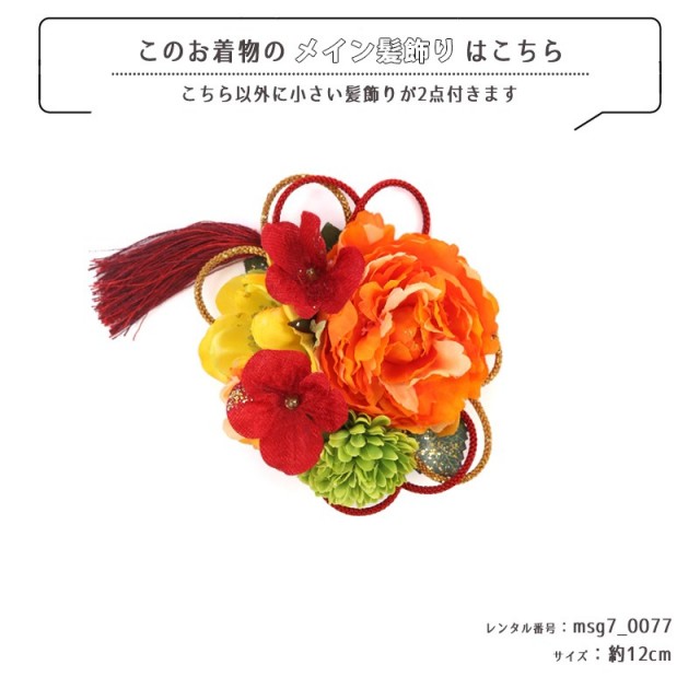 | コーディネート | 女の子七五三(7歳女の子用)に含まれる物:着物、長襦袢(カット袖)、作り帯、草履、バッグ、帯揚げ、箱迫、帯〆、しごき、末広(扇子)、足袋、腰紐(3本)、コーリンベルト、伊達締め、髪飾り |