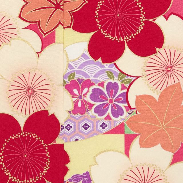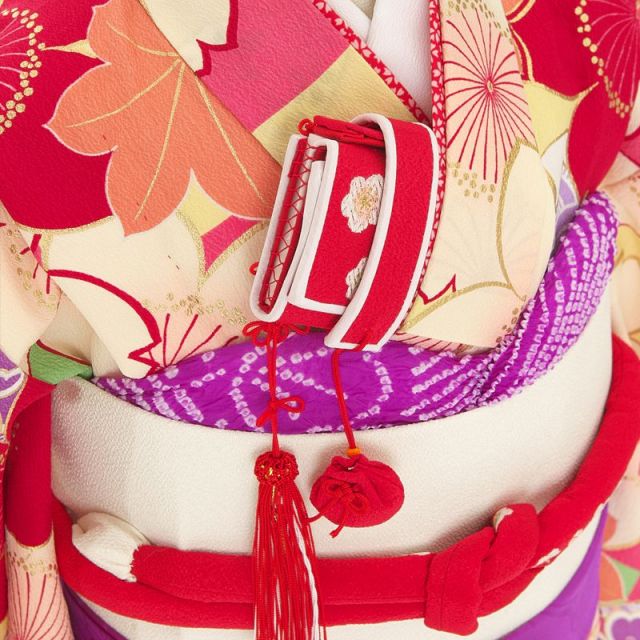 赤や白の大ぶりのさくらとオレンジのもみじがかわいらしいお着物です。その間から顔をのぞかせているのは小さなさくらや青海波や亀甲などの伝統的な柄。青海波は、「せいがいは」と読みます。字のとおり、海の波をデザイン化したものです。海の波は絶えることがなくどこまでもずっと続いていきます。そのように幸せがずっと続いていくようにといった願いが込められた柄なのです。亀甲柄もその名のとおり、亀の甲羅を模した六角形をした柄のことです。鶴は千年、亀は万年と言われるように、長寿を表現した縁起のよい柄。子どもの健やかな成長や幸せを望む思いがさりげなく託されています。青海波や亀甲、さくらやもみじは古くから愛されてきた古典調の柄ですが、このお着物では色合いが独特で、レトロ感とポップでかわいらしい感じが相まった新しい雰囲気に仕上げられています。帯の白、帯締めの赤、帯揚げとしごきの紫、こちらははっきりと鮮やかな色味を合わせているので、お着物の雰囲気を引き立たせています。