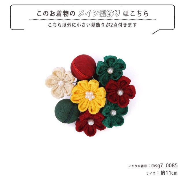 | コーディネート | 女の子七五三(7歳女の子用)に含まれる物:着物、長襦袢(カット袖)、作り帯、草履、バッグ、帯揚げ、箱迫、帯〆、しごき、末広(扇子)、足袋、腰紐(3本)、コーリンベルト、伊達締め、髪飾り |