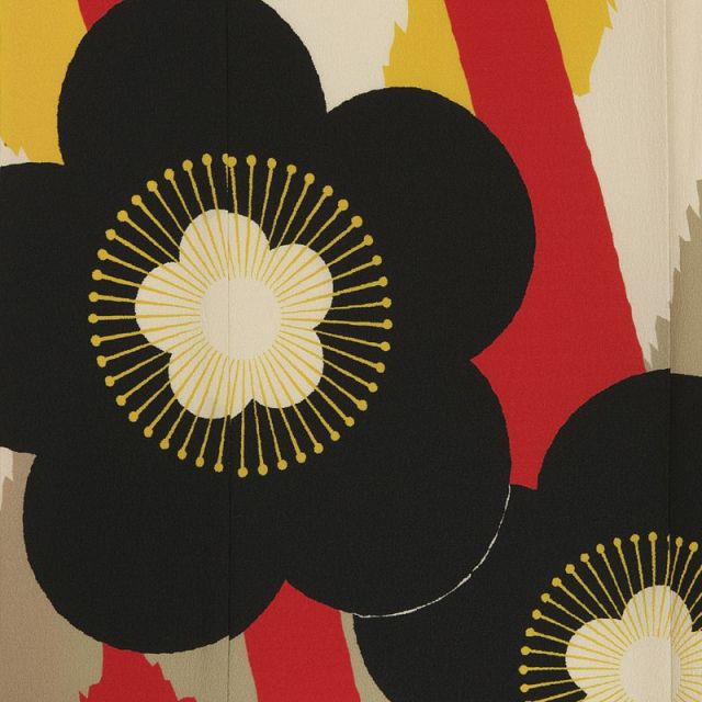 幾何学模様にも見える大胆な矢羽根柄の上に、梅の花が大きく描かれた、モダンで個性的な着物です。背景となる矢羽根柄は、ベージュ、黄色、赤とポップな色合い。このような配色と大柄にするとモダンな印象に映りますが、矢羽根柄は、昔から縁起が良いものとして、子どもの着物によく用いられた文様。矢の持つ魔除けの意味合いと、矢が真っ直ぐに飛んでいく様子が、子どもの成長を願う親心にぴったりだったのです。そんな矢羽根柄を背景に、黒で大胆に描かれた梅の花が目をひきます。一見北欧プリントを思い出させるようなデザインですが、昔から愛されてきた梅の花に懐かしさも感じる、レトロかつモダンな雰囲気です。帯は、梅の花と同じ黒地のものを合わせました。織り出された丸い手鞠柄が、黒地の帯に軽やかさを与えてくれます。帯揚げ、帯締めには女の子らしさを加える明るいピンク色。帯締めにもパールが通されたカラフルなものを合わせ、帯周りを一層可愛らしく仕上げました。少しお姉さんになったから、お洋服を選ぶ感覚で、はれの日の衣装もモダンで個性的なものを選びたい。そんなお嬢さんにぴったりの装いです。