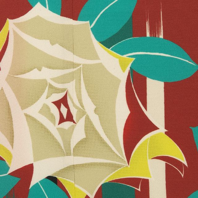 やや明るめの海老茶色の地に、絣模様のような縦縞と大きな薔薇の花が描かれた、モダンな着物です。薔薇は洋花ではありますが、その美しい姿から着物の文様としても大正の頃より多く取り入れられ、花びらが幾重にも重なる形が様々に意匠化されてきました。そんな薔薇の背景は、女学生の袴の色の定番、海老茶色。海老茶色は明治以降、多くの女学校の制服で袴の色とされました。そのイメージの根強さからも、活発かつ知的な印象を与える色として、若いお嬢さんにはぴったりの色味です。帯は、白地に手鞠を控えに織り出したものを合わせました。白い色が濃い地の着物の中に抜け感を作り、帯周りの小物を引き立てます。帯揚げ、しごきは、やや落ち着いたトーンで、鶸色と呼ばれる黄緑色を合わせました。パールも編み込まれてカラフルな帯締めが、お嬢さんらしい若々しさを与えます。ただ鮮やかで華やかな色やデザインでは物足りない、そんなお嬢さんにぴったりの、モダンでこなれた装いです。