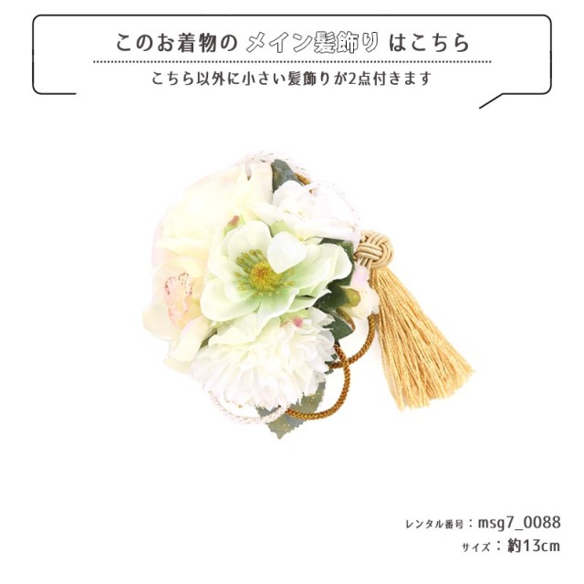 | コーディネート | 女の子七五三(7歳女の子用)に含まれる物:着物、長襦袢(カット袖)、作り帯、草履、バッグ、帯揚げ、箱迫、帯〆、しごき、末広(扇子)、足袋、腰紐(3本)、コーリンベルト、伊達締め、髪飾り |