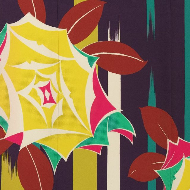 落ち着いた紫と山吹色の縦縞を背景に、大胆な薔薇の花を描いたモダンな着物です。その美しい姿が世界で愛されている薔薇。西洋では愛と美の象徴とされています。洋花の代表であるため、日本ではどうしても洋風にデザインするイメージがありますが、実は大正時代頃から着物の文様としても人気のあった花。ロマンチックかつモダンな印象となるため、特に若い女性に好まれていました。現在でも、大正浪漫風のデザインに、薔薇の姿を見つけることができます。そんな薔薇の花を、紫色と山吹色という着物らしい色遣いの上に描かれたこちらの着物は、まさに和洋折衷のモダンな空気を漂わせます。帯は、濃い地色の着物に対して白地ですっきりと。控えめながら金糸で可愛らしい手鞠が描かれています。筥迫もおそろいの生地のものを合わせました。帯揚げ、しごきは、お嬢さんらしいピンクを。着物の地色が落ち着いているからこそ、帯と小物には、抜け感のある白や、女の子らしいピンクを配し、写真のお顔写りが明るくなるような装いとしました。3歳の七五三では鮮やかで古典的な装いをしたから、少しお姉さんになった7歳ではモダンで少し個性的なお洒落がしたい、そんなお嬢さんにぴったりの装いです。