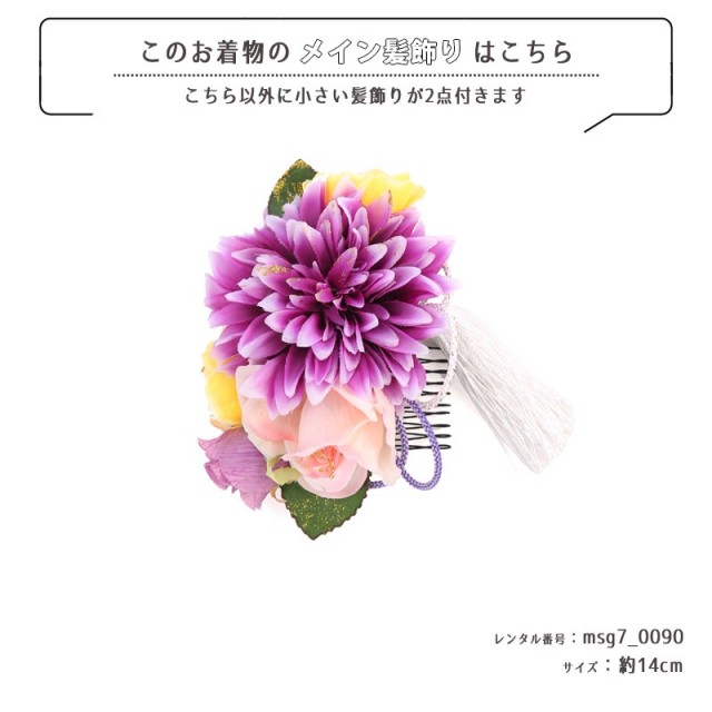 | コーディネート | 女の子七五三(7歳女の子用)に含まれる物:着物、長襦袢(カット袖)、作り帯、草履、バッグ、帯揚げ、箱迫、帯〆、しごき、末広(扇子)、足袋、腰紐(3本)、コーリンベルト、伊達締め、髪飾り |