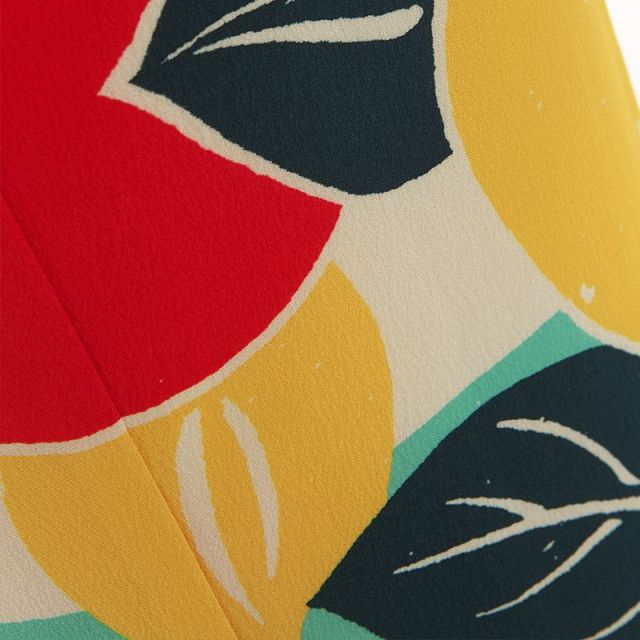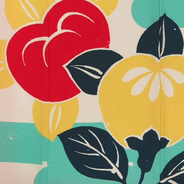 白の地色に描かれた爽やかなエメラルドグリーンのエ霞文(えがすみもん)は霞や雲のかかった風景を絵柄にしたものです。巻物などにも引用される柄はレトロモダンな雰囲気を演出してくれ、とってもお洒落。赤や黄色の“桃の実”はキュートでカラフルに描かれています。桃の木は古くから、“邪気払い”の力を持つとされ、魔よけの役割を担ってきました。有名な「桃太郎」のお話のイメージからも連想されるように、「幸運」「勝利」など力強い意味を持ちます。肩部分に描かれている“椿”は、葉の光沢が特徴的な花です。桃と同様、悪霊を払う力を持つとされ、聖なる力を秘めた花として扱われてきました。お子様の幸せな未来を願って、桃の実や椿の花を可愛らしくあしらったお着物は、ご家族の大切な日を、あたたかく見守ってくれる一着となるでしょう。