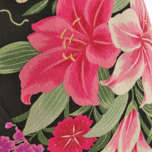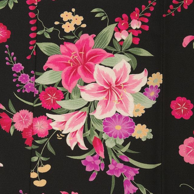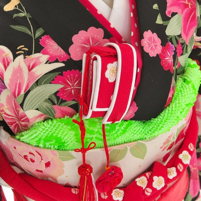 黒地に、ピンク色の花々が映えるこちらの晴れ着。百合、りんどう、藤、桜、撫子(なでしこ)、菊、ケイトウ・・・様々な花でいっぱいです。加えて、帯にはバラの花。筥迫(はこせこ)・帯締めには梅の花の刺繍。とことん、お花尽くしの装いになりました。お着物の世界と季節って、切っても切れない関係にあるのですが、このお着物は四季折々のお花を描いています。どの季節も美しく。どんなときも彩り豊かに。お嬢様が歩んで行かれる人生が先明るいことを心から願う、そんな意味を込めました。花はときに、女性の一生に例えられることがありますが、生命力豊かに咲き誇る様子がこれだけいっぱいに描かれていると、見ている側としても元気をもらえるような気持ちがします。ピンク地にドットの重ね衿。黒地に濃淡のピンクで柄をつける。蛍光グリーンの帯揚げ。「お着物」という、極めて伝統的な装いに、こういうちょっとした所にポップさを加えると、お嬢様世代にも親しんでいただきやすいのかな、とも思います。後から七五三のお写真等を振り返ったときに、「私が選んだお着物、すてきだったな、やっぱりこれにしてよかったな。」と思っていただければ、とても嬉しく思います。