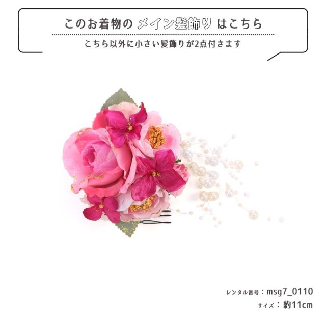 | コーディネート | 女の子七五三(7歳女の子用)に含まれる物:着物、長襦袢(カット袖)、作り帯、草履、バッグ、帯揚げ、箱迫、帯〆、しごき、末広(扇子)、足袋、腰紐(3本)、コーリンベルト、伊達締め、髪飾り |
