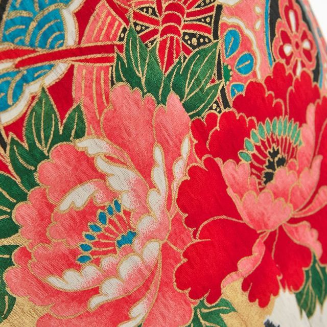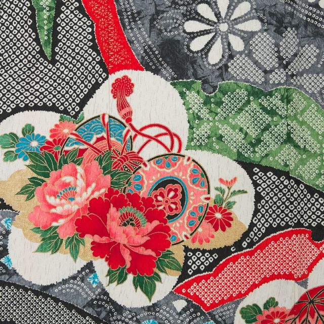総絞りとは、着物全体に「絞り染め」という技法が用いられた着物のことです。白に残したい部分を糸で括り、絞って色が入らないように染める技法です。この着物は総絞りではなく、総絞りに見えるようにプリントで柄が描かれています。プリントではありますが、一つ一つの柄が自然な形になっていたり、絞り染で見られる色の濃淡を表現していて、総絞りに見えるよう細かい工夫がなされていており、クオリティが高い一着です。黒っぽい印象のため、地味では?と思う方もいるかもしれませんが、ご安心ください!「総絞り風」であるため遠目に黒に見える部分にも細かい柄が入っていますので、むしろとても華やかです。着物の正面には、梅の輪郭で縁取られた中に、「鼓」と「牡丹」が鮮やかな色で描かれています。鼓は雅楽などで用いられる高貴な楽器。「音が鳴る」ことから「成る」という意味にも考えられ、「成功」や「成長」を象徴した柄でもあります。「牡丹」は「百花の王」と称されるほど、大輪でふっくらした花が華やかに咲きます。その姿から「気品」や「幸福」を意味する花として古くから着物の文様に使われてきました。 豪華絢爛な「総絞り風」「鼓」「牡丹」が七五三の喜びを更に引き立てます。古風でおしとやかな雰囲気満開のオシャレで高貴な着物!