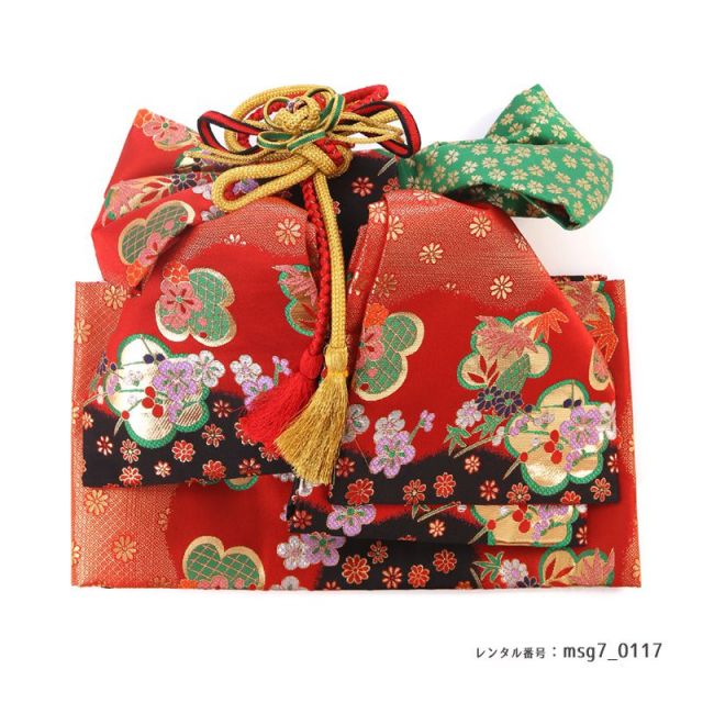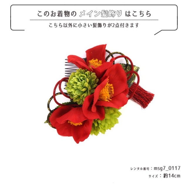 | コーディネート | 女の子七五三(7歳女の子用)に含まれる物:着物、長襦袢(カット袖)、作り帯、草履、バッグ、帯揚げ、箱迫、帯〆、しごき、末広(扇子)、足袋、腰紐(3本)、コーリンベルト、伊達締め、髪飾り |
