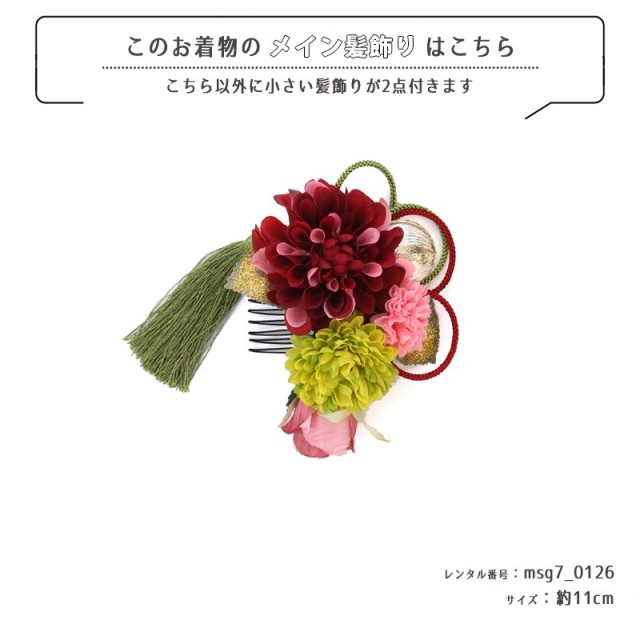 | コーディネート | 女の子七五三(7歳女の子用)に含まれる物:着物、長襦袢(カット袖)、作り帯、草履、バッグ、帯揚げ、箱迫、帯〆、しごき、末広(扇子)、足袋、腰紐(3本)、コーリンベルト、伊達締め、髪飾り |