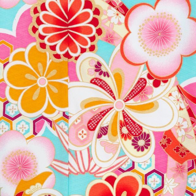 水色地に、明るい色遣いで様々な花がたっぷりと描かれた、華やかで女の子らしい装いです。地色は爽やかな水色。そんな地色に赤系統の色遣いで、桜、梅、菊、その他様々な花が意匠化されて描かれています。花の中には、七宝文様、亀甲文様のような古典的な吉祥文様を描いたり、さらに小さな花で埋めつくしたり。柄は花だけでも飽きさせず、一つ一つを見るほどに楽しい、凝ったデザインです。水色地に赤系統の柄が映えるのは、とても着物らしい光景です。帯は、すっきりとした黒地に、小さな梅の花をカラフルに描かれたものを合わせました。伊達襟、帯揚げ、しごきには、着物の柄の赤と相性が良く、さし色として際立つ黄緑色をで、着物らしい色合わせに。帯と共布の筥迫も、胸元に黒地がのぞくことで、全体を引き締めてくれます。着物を着る機会の少ない今だから、七五三という貴重な機会には可愛らしく、しかも着物らしい装いを。そんなご希望にぴったりの装いです。