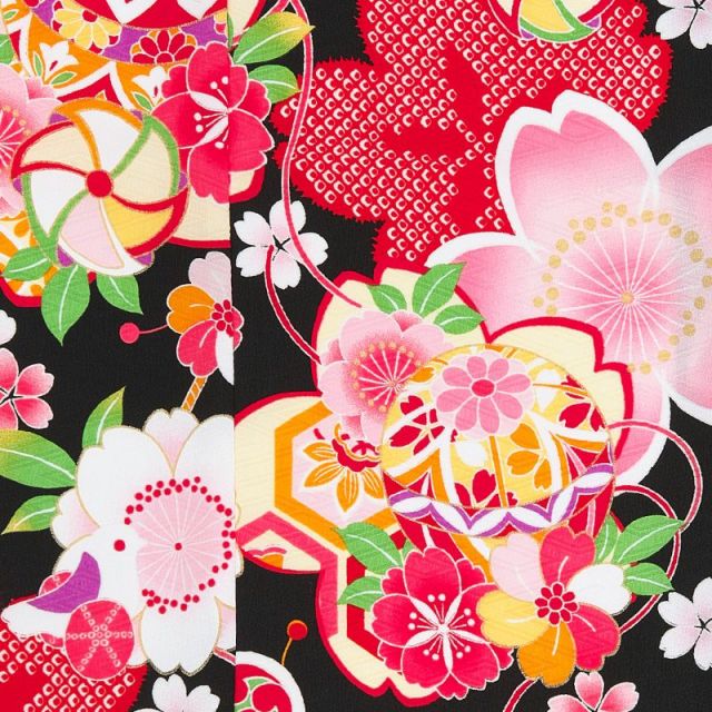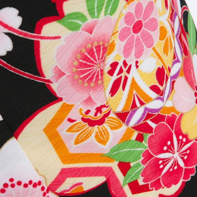 黒地に様々なデザインの桜が色とりどりに咲き乱れる、華やかな着物です。日本を代表する花・桜。その桜の花が着物全体に、大きさ、デザイン、色彩を様々に変えながら描かれています。大きな桜の枠取りには、縁起の良く格調も高い亀甲文様、姫君の華麗なおもちゃである手鞠、濃淡の小桜などがぎっしり描かれ、とても賑やか。疋田絞り柄(鹿の子絞り柄)の桜は、古典的な可愛らしさを添えてくれます。そして、それらの間にも、大小、濃淡の桜の花達。黒地の着物はともすれば粋な空気になってしまうところ、この着物は柄と色遣いのお蔭で可愛らしく仕上がりつつ、黒がすっきりとした印象にしてくれます。帯は、着物の華やかさを引き立てる、穏やかな金色の地のもの。小物も、着物の古典的な雰囲気に合わせて、疋田絞り柄の伊達襟や、帯揚げとしごきの反対色の組み合わせで、着物らしい雰囲気に仕上げました。どんな背景のお写真でも引き立ち、お顔写りもはっきりとさせてくれる、華やかな装いです。