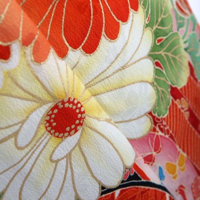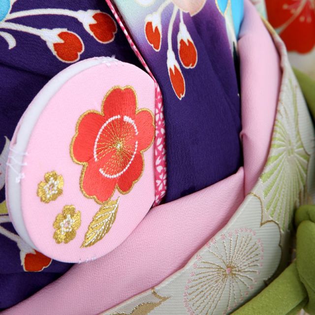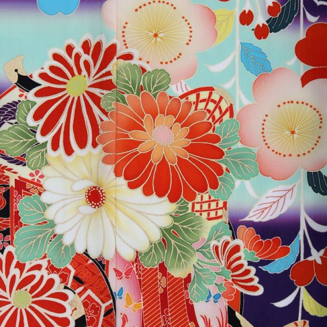 茄子紺(なすこん)色に、カラフルな満開の花々が目に飛び込んできます。水色が効き色ですね。とても個性的な色使いですが、柄自体は古典的なのできちんとお着物としての存在感を残しています。珍しい丸型の箱迫(はこせこ)。四角い形がポピュラーですので、目を引くアイテムです。お着物の世界では、前の裾あたりをメインの柄として、構図を考えてあります。このお着物の場合、一番メインの部分は「御所車(ごしょぐるま)」でしょう。画像の中に赤く彩色された車輪と、黒塗りの引き手部分が見つかるでしょうか。その御所車が、大ぶりの菊の花で飾られています。今でこそ菊はポピュラーな花ですが、奈良時代ごろ中国から伝えられたときの用途は「観賞用」ではなく「薬用」でした。どうやら、神聖な力が秘められた、と考えられていたようです。実はこちらのお着物、“ママタレント”としても活躍されている、乙葉さんのプロデュースなのです。格調高い古典文様を用いながらも、愛らしく清楚な仕上がりは、ご家族を大切にされている乙葉さんならではの心遣いかもしれませんね。鮮やかな色使いと、古典文様から滲み出る独特の優しさが融合した素敵な一着です。ご家族の大切な思い出のひとこまにオススメ。