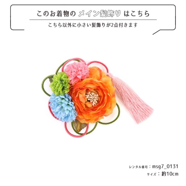 | コーディネート | 女の子七五三(7歳女の子用)に含まれる物:着物、長襦袢(カット袖)、作り帯、草履、バッグ、帯揚げ、箱迫、帯〆、しごき、末広(扇子)、足袋、腰紐(3本)、コーリンベルト、伊達締め、髪飾り |