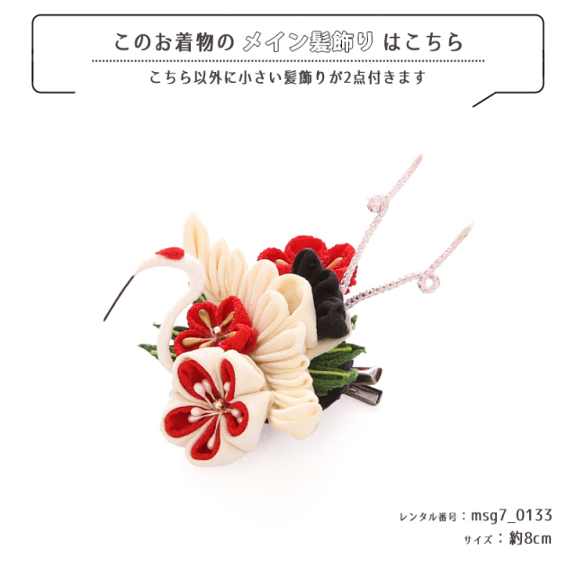 | コーディネート | 女の子七五三(7歳女の子用)に含まれる物:着物、長襦袢(カット袖)、作り帯、草履、バッグ、帯揚げ、箱迫、帯〆、しごき、末広(扇子)、足袋、腰紐(3本)、コーリンベルト、伊達締め、髪飾り |