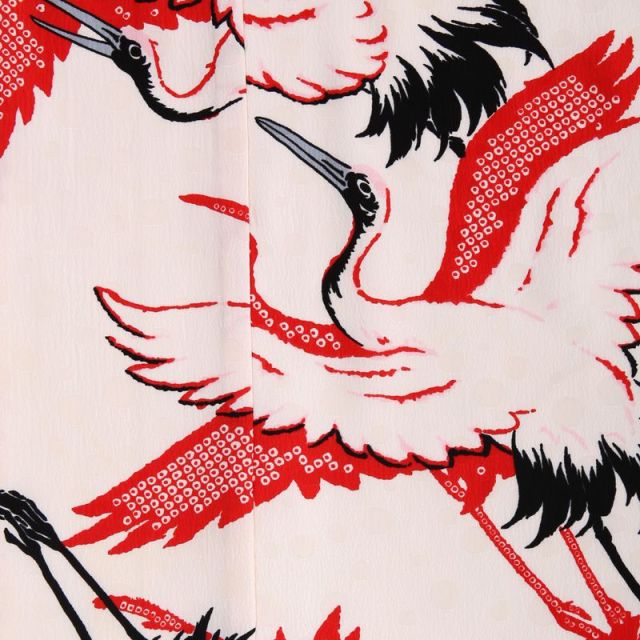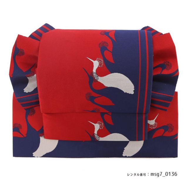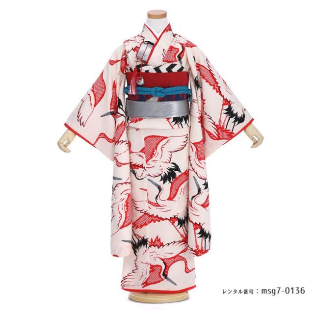 パッと見て、「これはおめでたい装いだな」と思うのは、やはり赤と白をメインにした色彩だからでしょう。そして、全面に飛び交う鶴たち。日本人ならではの、お祝いの表現です。極めて伝統的なものであるお着物の世界に、モダンの風を吹き込むブランド「Modern Antenna(モダンアンテナ)」。大正?昭和初期ごろの、レトロなグラフィックを応用して、素敵な晴れ着に仕上げました。このデザインには、どんな願いが込められているのでしょう。鶴は、長寿の象徴として有名です。古代中国の書物のなかに、仙人に仕える生き物として鶴と亀が書かれた一文があったことが由来だと言われています。転じて、おめでたいことの象徴となり、様々なお着物衣装に使われる文様となりました。帯締めに同色系を持ってきても悪くはないのですが、ここはあえて少し緑がかった青色「花浅葱(はなあさぎ)」で外すことで、コーディネートを引き締めました。お洋服と同じように、お着物の世界でも“どこで上手に引き算をするか”が大事なポイントです。そして、鈍い光を放つシルバーの箱迫(はこせこ)と志古貴(しごき)で、カッコよく。女の子は、甘いだけじゃないのよ!と、少し小粋な雰囲気も感じられます。令和の時代を、たくましく生き抜く力をもらえる、そんな晴れ着です。