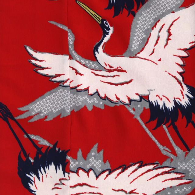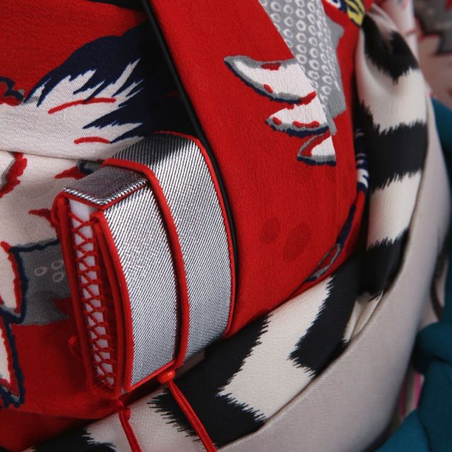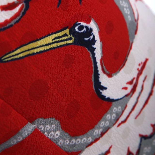 真っ赤な地色が目を引くこちらの一着。「Modern Antenna(モダンアンテナ)」というお着物ブランドの晴れ着です。作り手が、本当に心から「良い」と思えるものを提供したい。シンプルでありつつ、遊び心のあるものをつくりたい。そういった思いを大切に、ものづくりをされています。鶴の後ろにグレーの影をつけることで、立体的に表現しました。また、鶴を表現する際によく、「白・黒・赤」が使われますが、じっくり見てみると黒ではなく「紺色」を用いています。本当に微妙な差ではありますが、そのおかげで全体に深みを増しているように見えます。そのほか、描き方によっても印象は変わりますが、この鶴は羽毛の感じがよく出ていて、ふわふわと気持ち良さそう。大胆な構図であるがゆえに、色使いがとっても大事。色をたくさん使わないこと、トーンを同じにすること。このコーディネートは、そのルールを踏襲(とうしゅう)しているので、デザインはモダンですが、しっくりストンと落ち着きます。帯締めに、青系を持ってくると、目線が自然と上がります。自ずと、腰の位置が高くスタイルがよく見えるんですよ。おねえさんへと成長してきたお嬢様が、さらに大きく見えるのではないでしょうか。