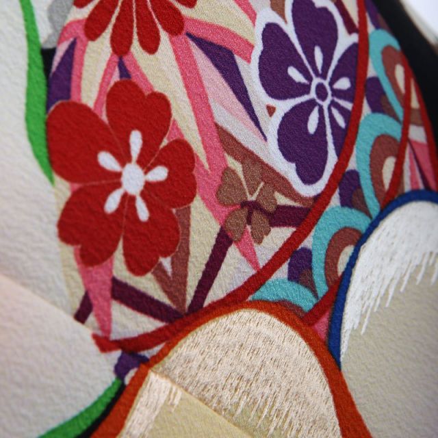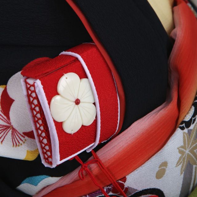 大きく描かれた“梅”と、それに寄り添うように咲く“桜”がシックな黒地に映え、晴れの日のお着物にふさわしい美しさと可愛らしさを演出します。“梅”は寒い冬を越え、まだ肌寒い初春にいち早く花を咲かせます。その姿は古くから尊ばれ、「忍耐」「美」を表す花として愛されてきました。ふんわりと描かれた梅がお着物の中でなんとも可愛らしく咲いています。“桜”は「国花」でもあり、日本人にはなじみの深い花です。春なるといっせいに咲くことから「繁栄」「豊かさ」を願って描かれます。晴れの日のお着物には欠かせないお花です。梅と桜の文様が描かれた“毬”は、花々の中をコロコロと動いているようで可愛らしいですね。“毬”はその丸い形から、「丸くおさまる」「丸々と育つ」という意味を持ちお子様が幸せに成長し、平穏に暮らせるようにとの願いが込められています。お子様の可愛らしさを引き立てる素敵な一着になることでしょう。