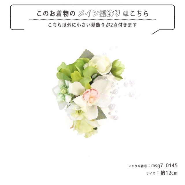 | コーディネート | 女の子七五三(7歳女の子用)に含まれる物:着物、長襦袢(カット袖)、作り帯、草履、バッグ、帯揚げ、箱迫、帯〆、しごき、末広(扇子)、足袋、腰紐(3本)、コーリンベルト、伊達締め、髪飾り |