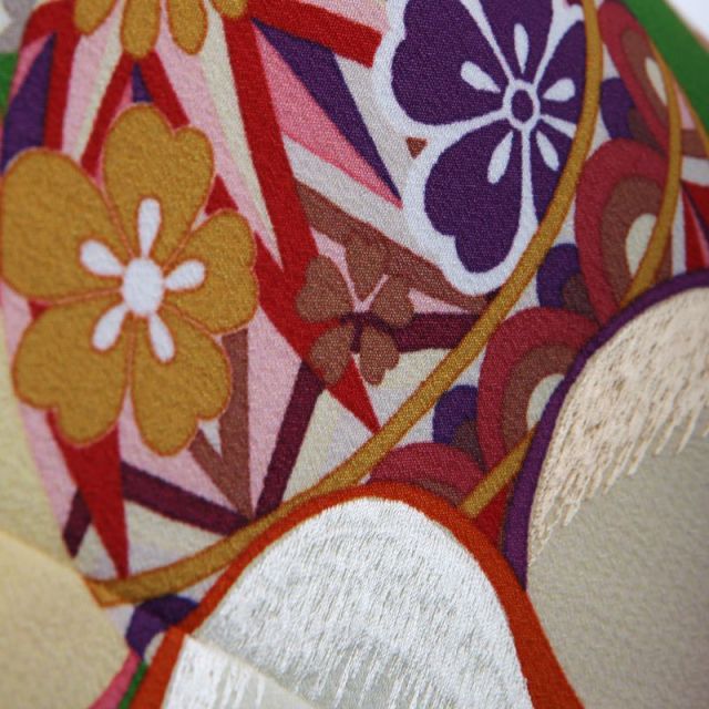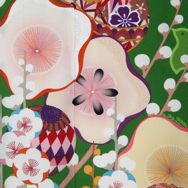 美しくも可愛らしい花々が鮮やかな緑の中でみずみずしく咲きます。緑がちょっぴり個性的で、元気で活発なお子様にぴったりの一着です。大きく描かれている“梅”は、冬が終わると春の訪れとともに咲く花。「忍耐」や「美」の象徴とされています。丸い輪郭でふんわりと描かれた梅が女の子の可愛らしさを引き立てます。“桜は”古くから日本人に愛されてきた花。命が芽吹く春の花なのでおめでたいイメージを連想させる柄として着物に好んで描かれてきました。「繁栄」や「豊かさ」を意味しています。“毬”はその丸い形から連想されるように、「丸くおさまる」「丸々と育つ」という意味を持ちます。お子様の幸せと、平穏な暮らしを願う気持ちが込められています。ご家族の大切な晴れの日を笑顔いっぱいに演出してくれる一着でしょう。