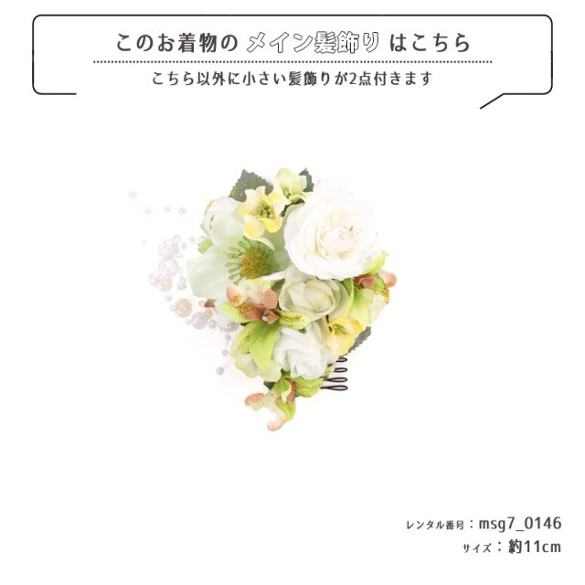 | コーディネート | 女の子七五三(7歳女の子用)に含まれる物:着物、長襦袢(カット袖)、作り帯、草履、バッグ、帯揚げ、箱迫、帯〆、しごき、末広(扇子)、足袋、腰紐(3本)、コーリンベルト、伊達締め、髪飾り |