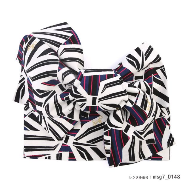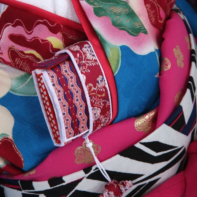 澄み渡る青空なようなブルーに、優しくそして大きく咲くのは“牡丹”の花。はっきりとした青色に対し、花や葉はふんわりと優しい色合いで描かれ、そのコントラストがお互いを引き立てています。牡丹の花には金色の縁取りがほどこされ、華やかな雰囲気を演出します。お着物の柄として人気の“牡丹”は、花びらを幾重にも重ね大きな花を咲かせることから「百花の王」と言われています。その堂々と咲き誇るさまから「富貴さ」「高貴さ」「富」の象徴とされ、お子様の幸せな未来を願う想いが込められています。帯はストライプのリボン柄。お着物全体をキュッと引き締める黒色で、個性的、かつ遊び心のある柄がキュートでポップ。他にはないアンティークでおしゃれな雰囲気を楽しめますよ。元気で活発なお子様の素敵な笑顔にぴったりの一着です。