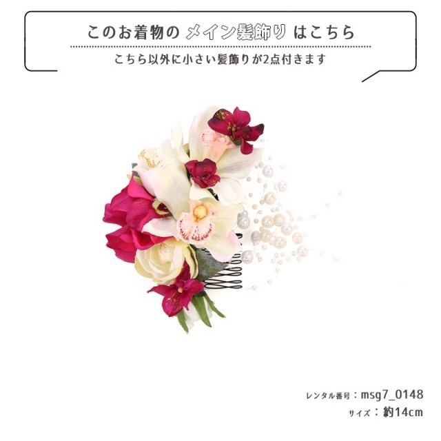 | コーディネート | 女の子七五三(7歳女の子用)に含まれる物:着物、長襦袢(カット袖)、作り帯、草履、バッグ、帯揚げ、箱迫、帯〆、しごき、末広(扇子)、足袋、腰紐(3本)、コーリンベルト、伊達締め、髪飾り |