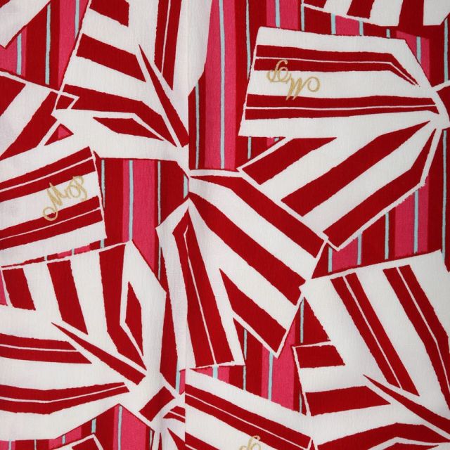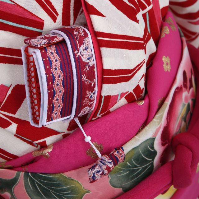 ピンクとグレーのストライプに赤と白のストライプが交じわります。赤と白のストライプは女の子が大好きな“リボン”。いくつも重ねて描かれることで、伝統的な「麻の葉文様」のようにも見えます。「和洋ミックス」なお着物は個性的でありながら、華やかな雰囲気をかもしだす、そんな一着です。「普通の着物じゃつまらない」「ちょっと遊び心のある着物がいいな」そんなご家族におススメです。・帯には、お着物に描かれる定番のお花“牡丹”が描かれ、アクセントに。牡丹は小さなつぼみから、花びらをふんだんに重ねた大きな花を咲かせることから「百花の王」と言われています。優雅に咲くさまから「富貴さ」「高貴さ」「富」を象徴し、お子様の幸せな未来の願う想いがこめられています。モダンで個性的なお着物が、お子様の笑顔を存分に引き出し、ご家族の笑顔で満ちた晴れの日になることでしょう。