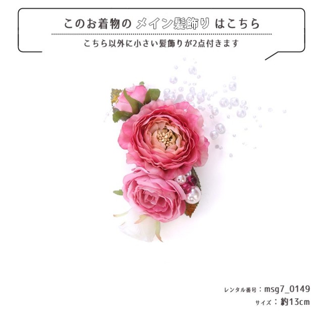 | コーディネート | 女の子七五三(7歳女の子用)に含まれる物:着物、長襦袢(カット袖)、作り帯、草履、バッグ、帯揚げ、箱迫、帯〆、しごき、末広(扇子)、足袋、腰紐(3本)、コーリンベルト、伊達締め、髪飾り |