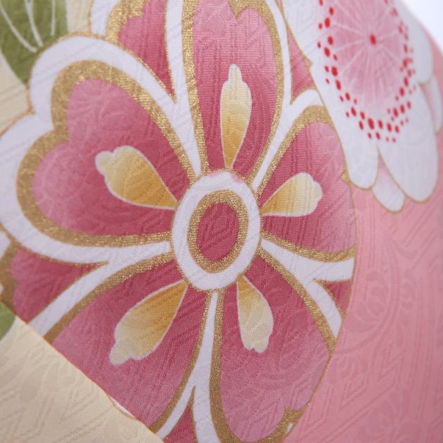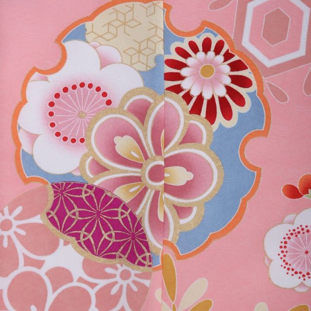 生地の地紋は、紗綾型に蘭や菊を配した“本紋”という合せ文です。紗綾型は『卍』の漢字を崩して連続模様にしたもの。絶えることなく長く続くという『不断長久』の意味から、繁栄や長寿を願う文様です。端正で気品ある印象の紗綾型に蘭や菊をあしらった本紋は、お着物をさらに格調高いものへと引き立ててくれます。可憐なピンク色のお着物は、雪と梅・桜・菊などの優しい美しさで散りばめられています。雪は、ふんわりした牡丹雪のような形の雪輪文様と、つららの形をした氷柱雪が見られます。それぞれ雪の結晶を文様化したもので、神秘的で美しい雪は古くは六花と呼ばれ、人々ははかない美しさに思いを寄せてきました。雪どけ水の恵みによって花が咲き誇り、実り豊かな季節になる。雪は豊年の兆しとされ、縁起の良い吉祥文様です。梅・桜・菊と日本を代表する花々は、お子様の美しい成長と幸せな未来を願う意味を込めて描かれており、麗しい四季の移ろいを雪の文様とともに表現しています。七五三の素敵なお姿は7歳の今しか見られません。そんな儚げな可愛らしさをいつまでも心に留めておきたくなるお着物です。